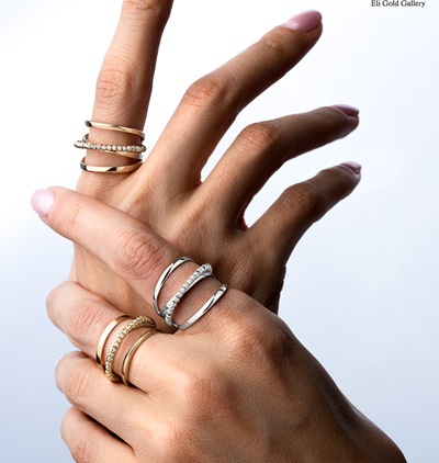 - انگشتر چندلایه: استفاده هم زمان از چند انگشتر با عرض ها و طراحی های مختلف، عمق و جذابیت زیادی به استایل زمستانی می دهد. این سبک به ویژه در ترکیب با لباس های ساده و تک رنگ زمستانی بسیار چشم نواز است. مدل هایی از انگشتر وجود دارند که یک انگشتر از ترکیب چند طرح ساخته شده است؛ این انگشترها به شدت برای زمستان مناسبند. نمونه این انگشترها را در تصویر ارائه کرده ایم.